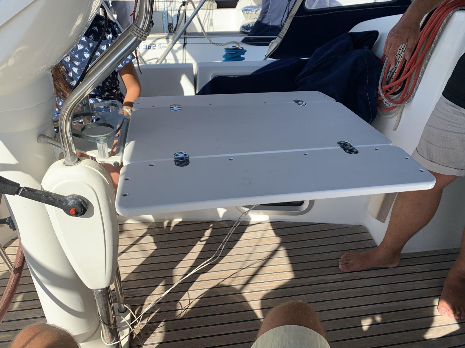 Alarme moteur, Eau sous pression, 3 Batteries, Passavant en teck, Douche de cockpit, Bossoir pour HB (1 gruetta), Passerelle, Plateforme arrière, Pompe de cale manuelle, Cockpit en teck, Prise de quai, Guindeau électrique, Echelle de bain, Chaise support HB, table de cockpit (con copertura), Table pliante de salon, 4 Winch (con copriwinches).