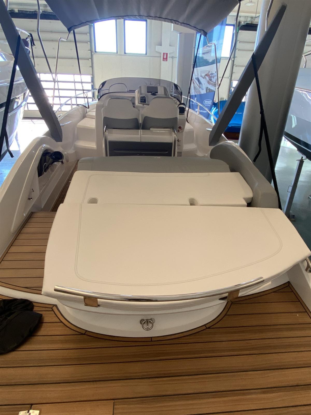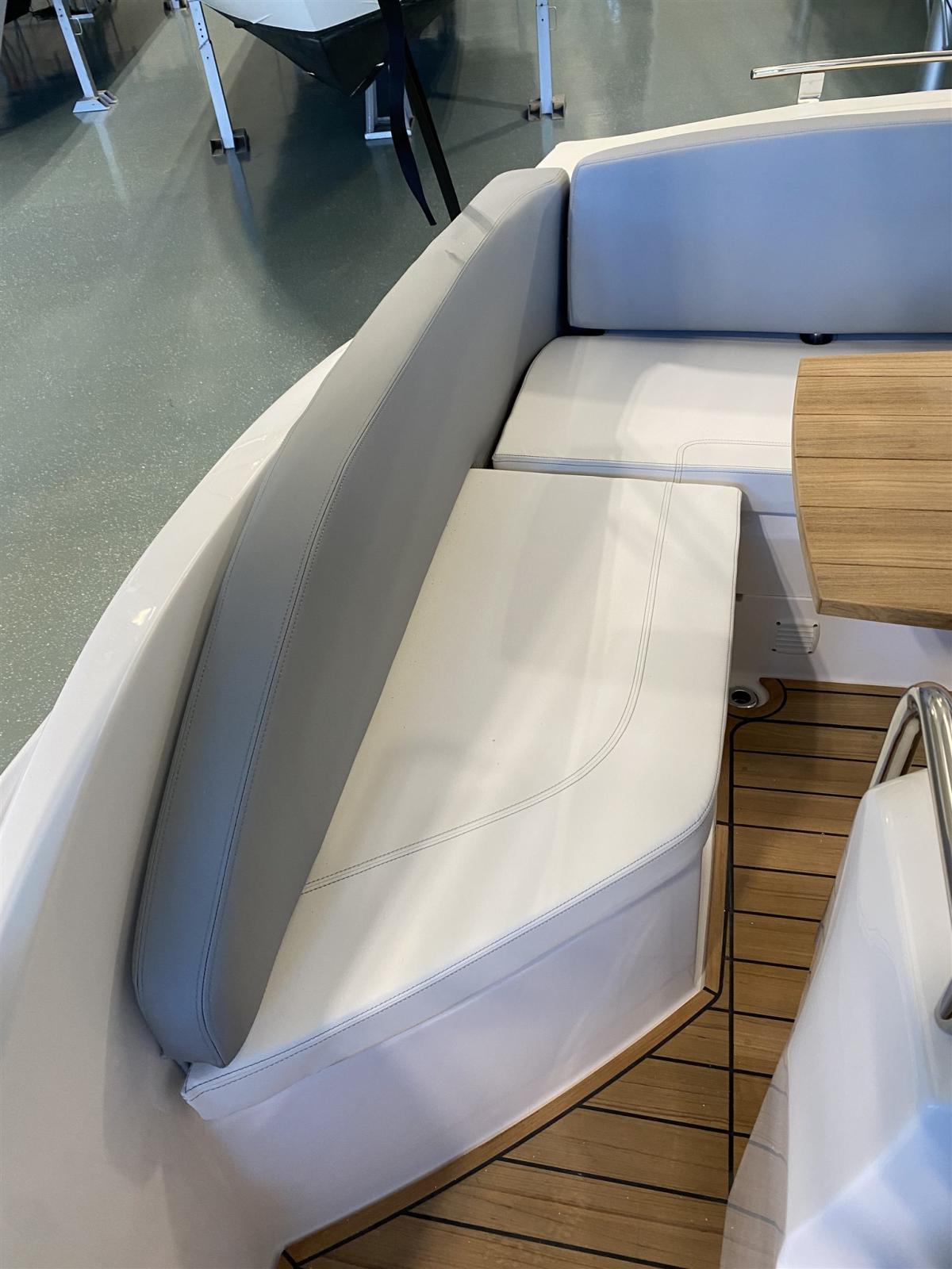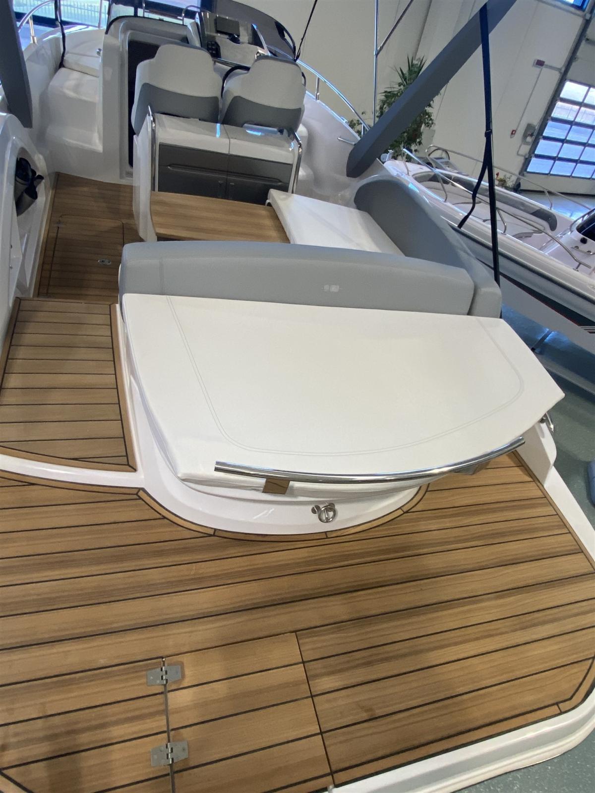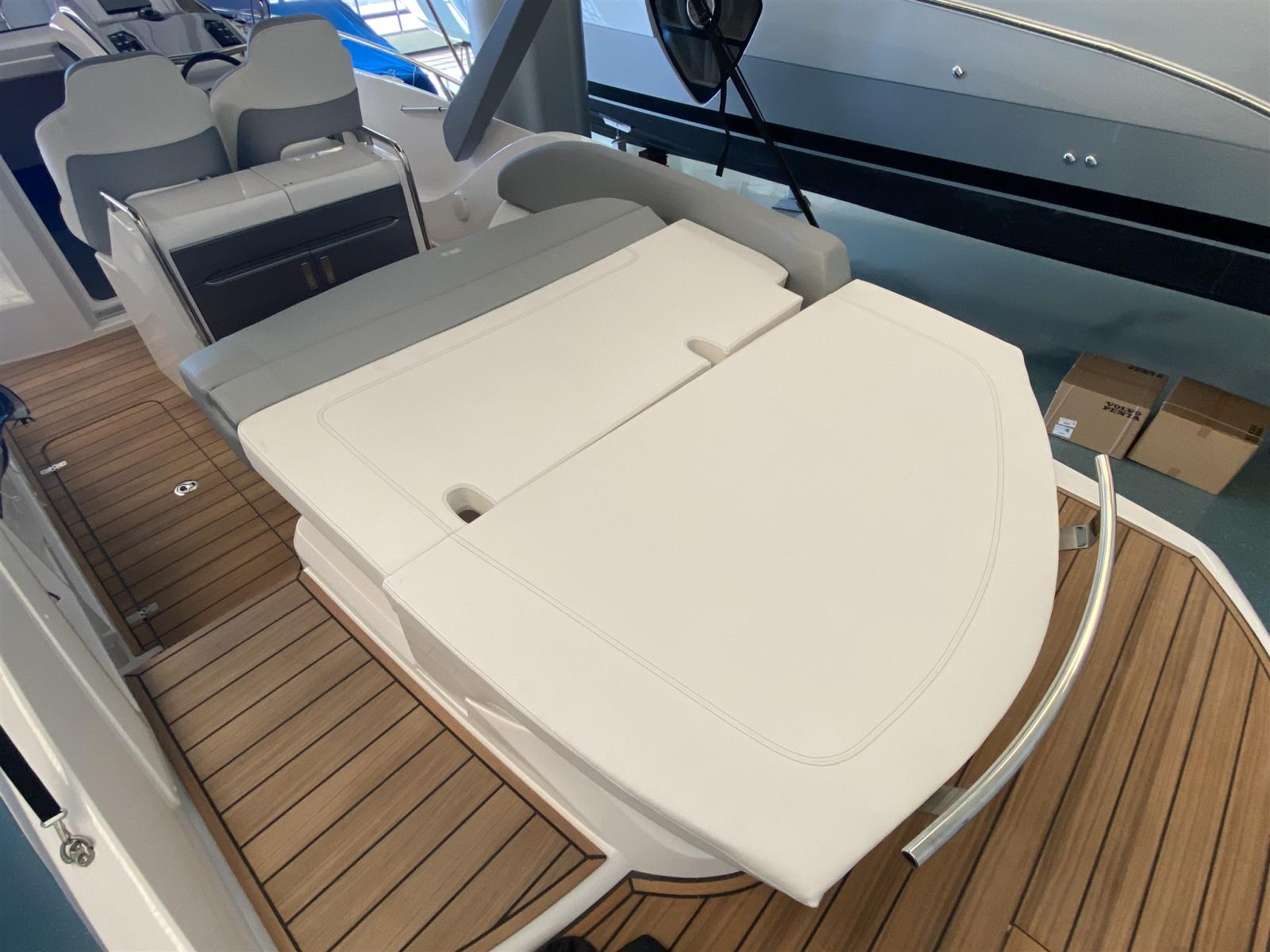 Eau sous pression, 2 Batteries, Couleur spéciale (DARK GREY), Douche de cockpit, Flaps hydrauliques, Extincteur(s) fixe(s), Éclairage de courtoisie, Spots sous-marins, Plateforme arrière (teak), Pompe de cale manuelle, Cockpit en teck, Guindeau électrique, Echelle de bain, table de cockpit, Corne.