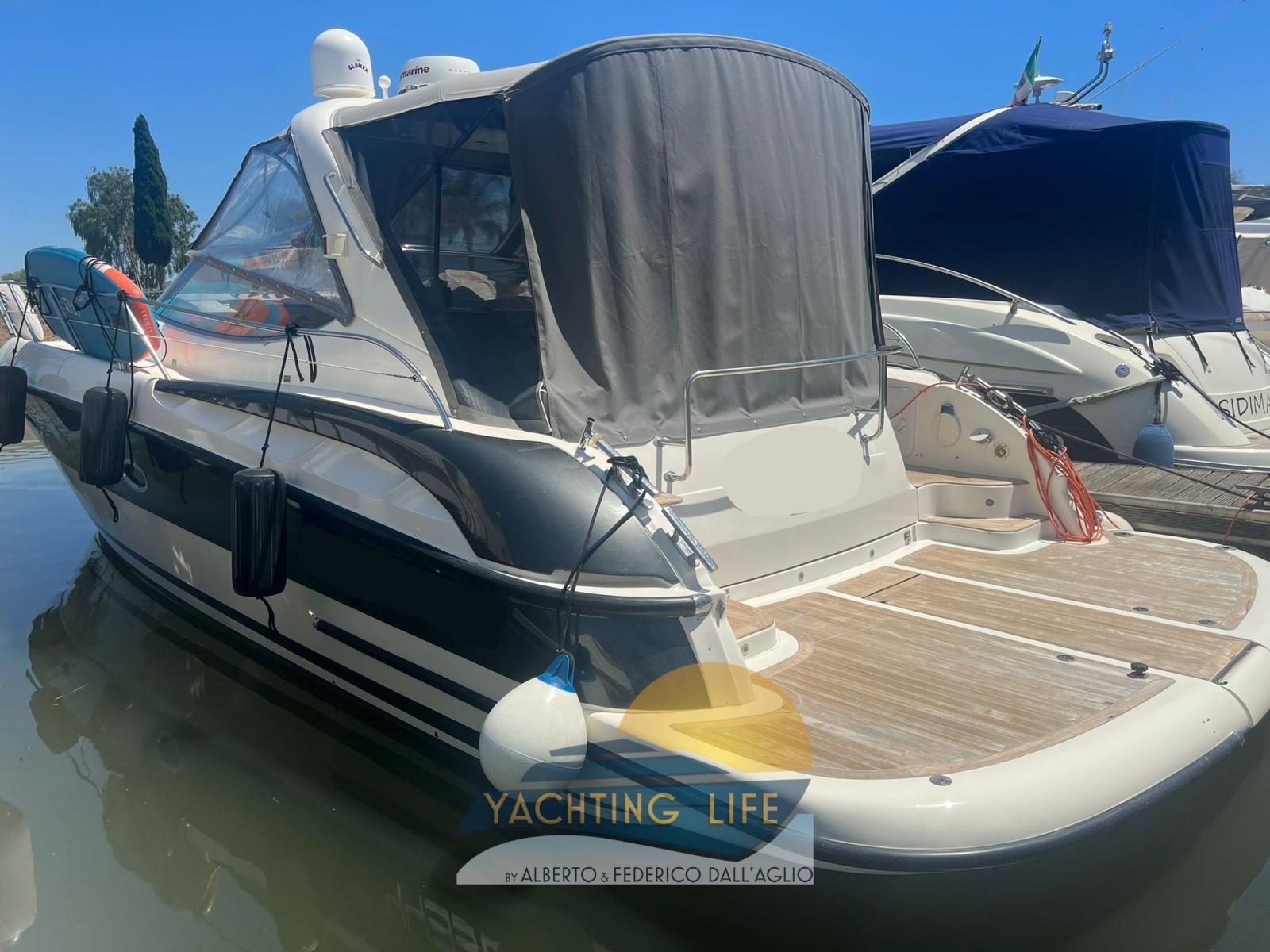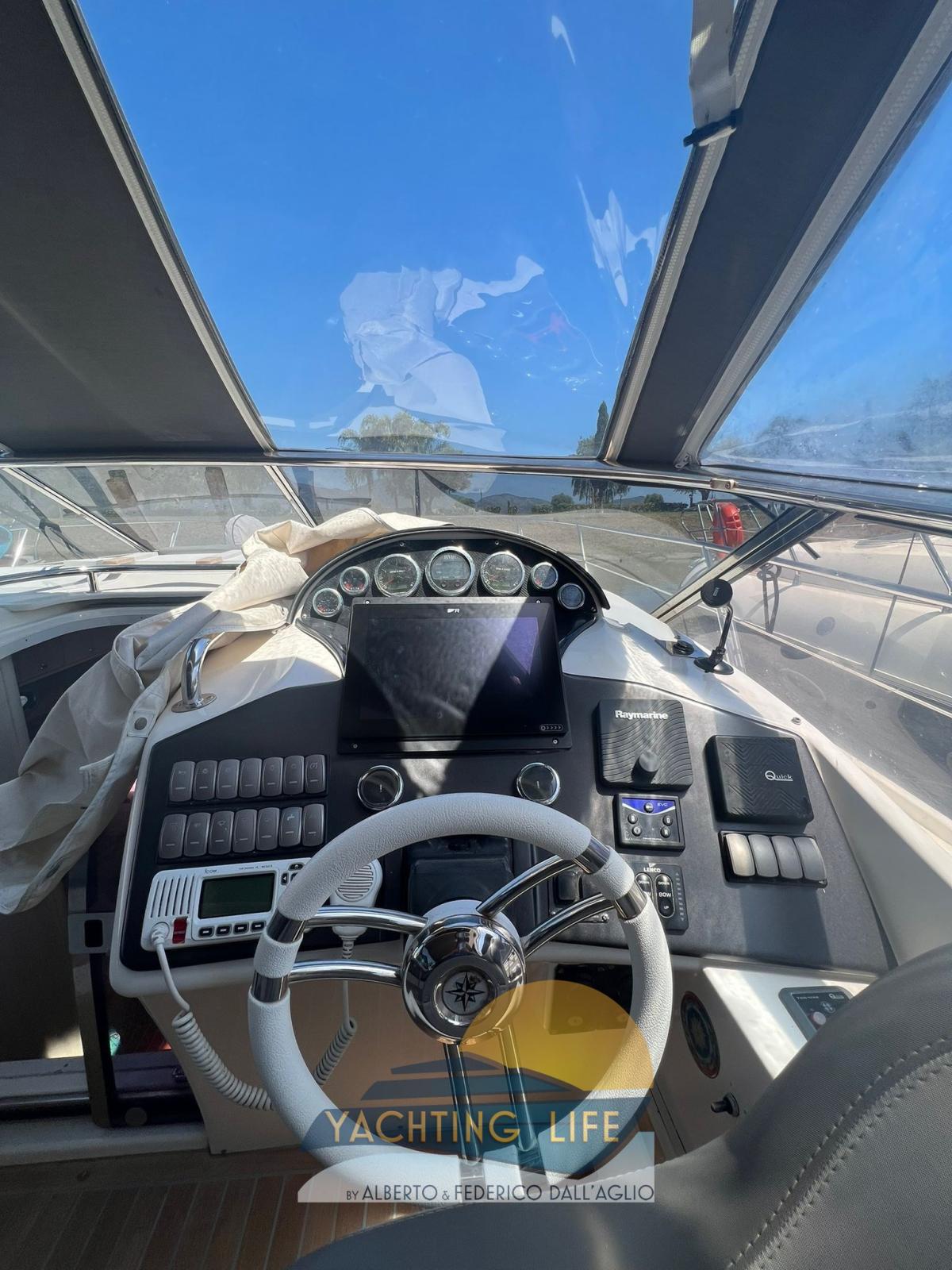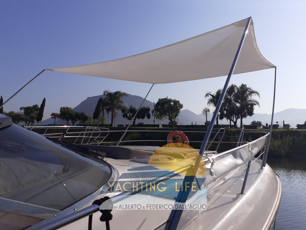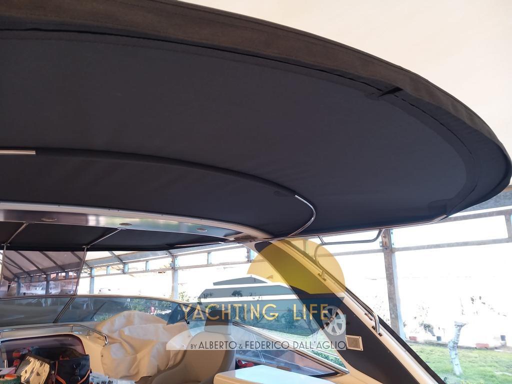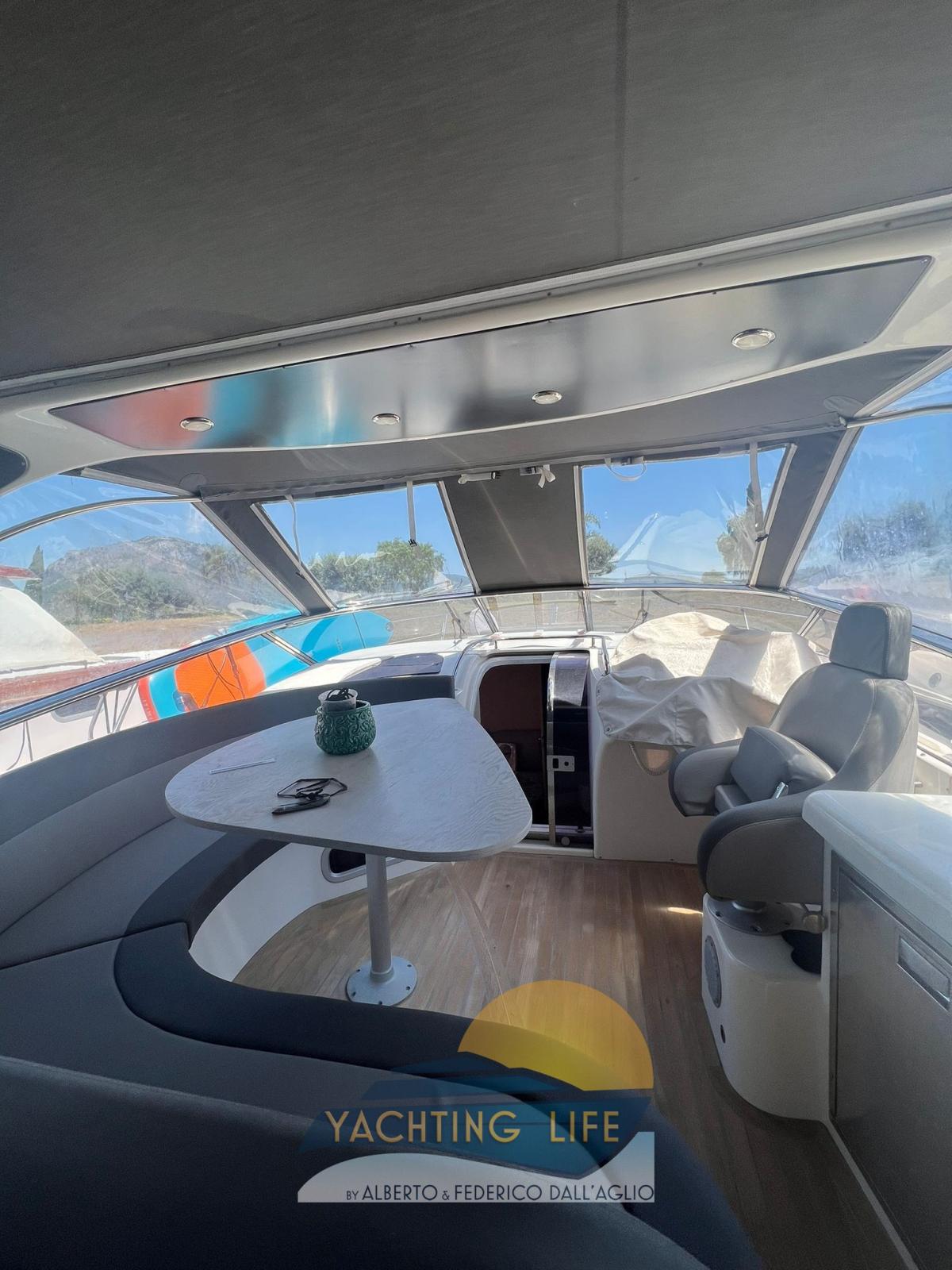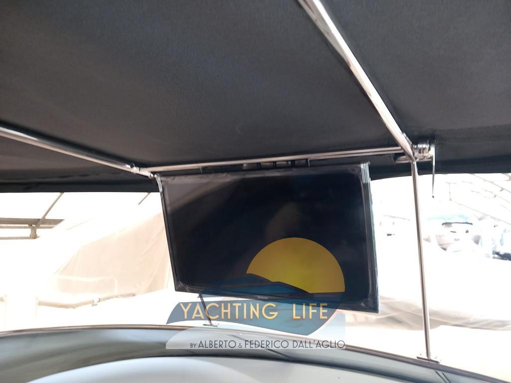 Alarme moteur, Ouverture du compartiment moteur électrique, Eau sous pression, Couleur spéciale (Grigio metallizzato), Douche de cockpit, Flaps hydrauliques, Garage à annexe, Indicateurs de flaps, Lavabo dans le cockpit, Éclairage de courtoisie (Led), Moteur d'annexe, Passerelle (Idraulica), Plateforme arrière (In teak), Pompe de cale automatique, Pompe de cale manuelle, Porte latérale, Cockpit en teck, Prise de quai, Rollbar, Guindeau électrique, Echelle de bain, table de cockpit, Annexe, Corne.