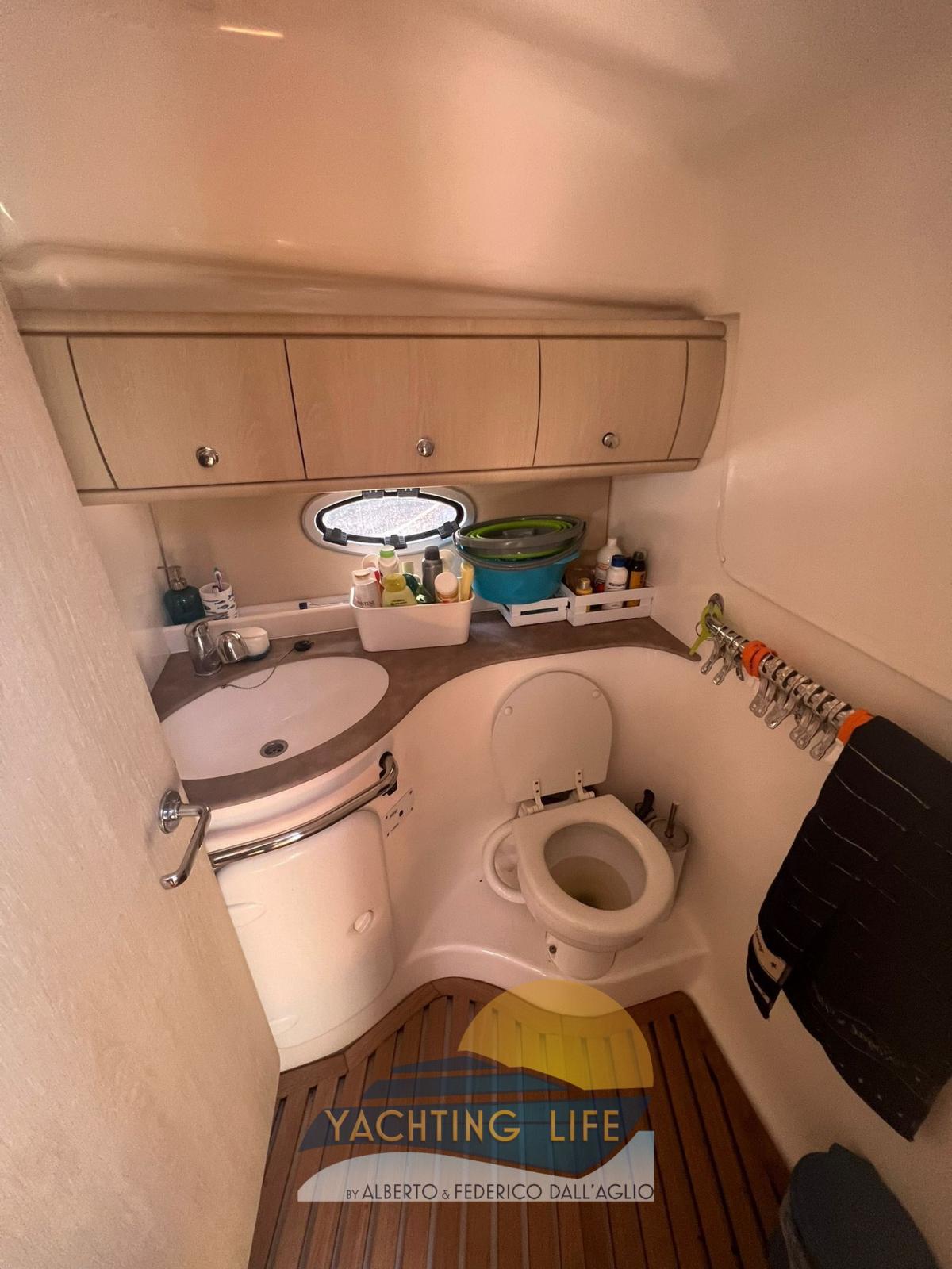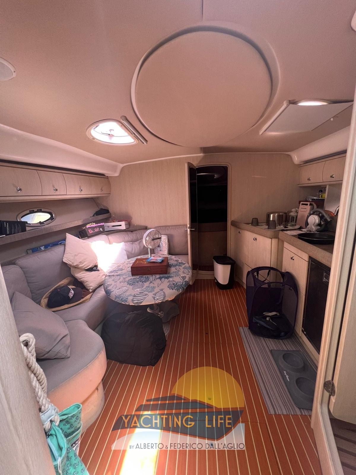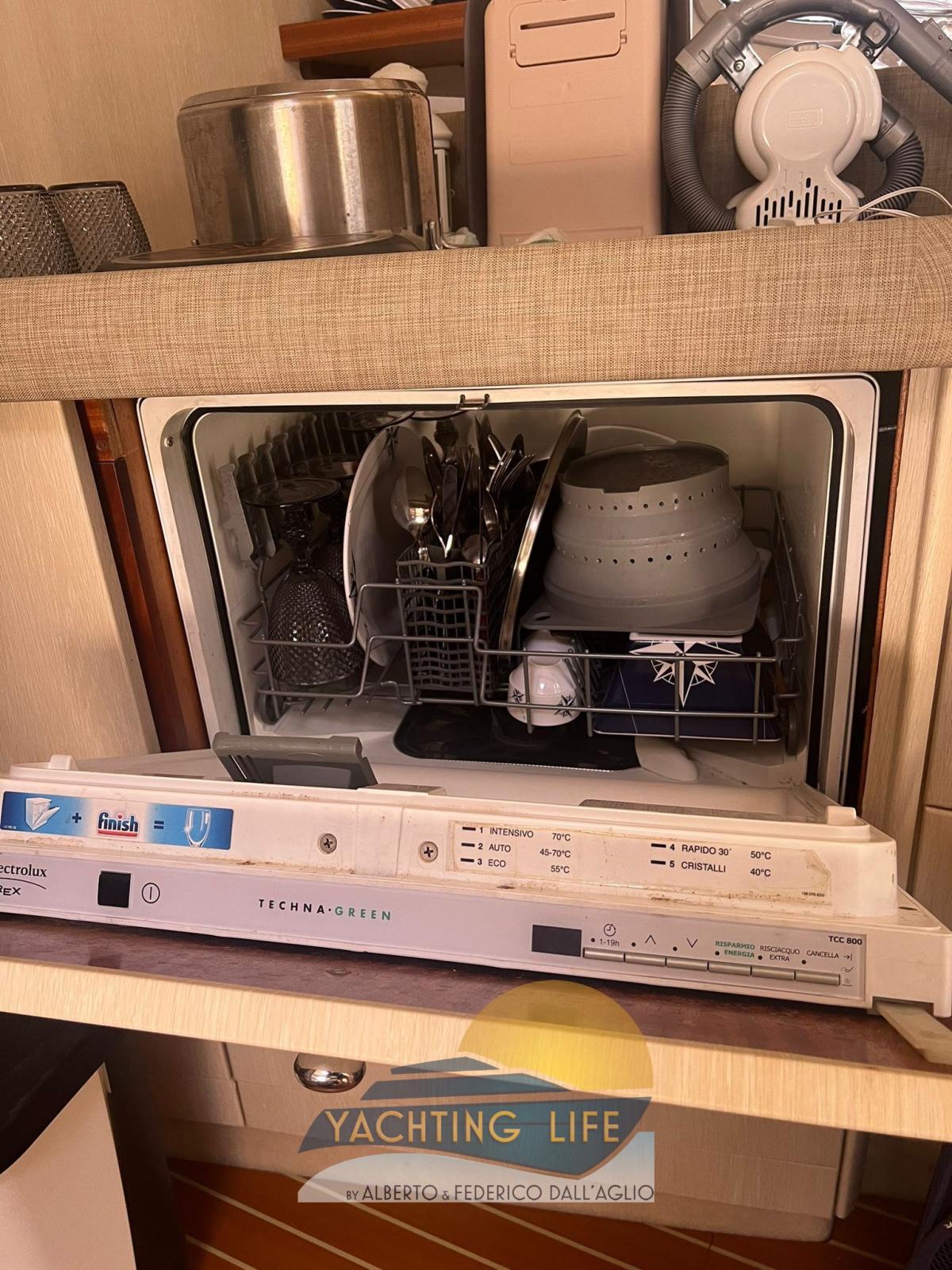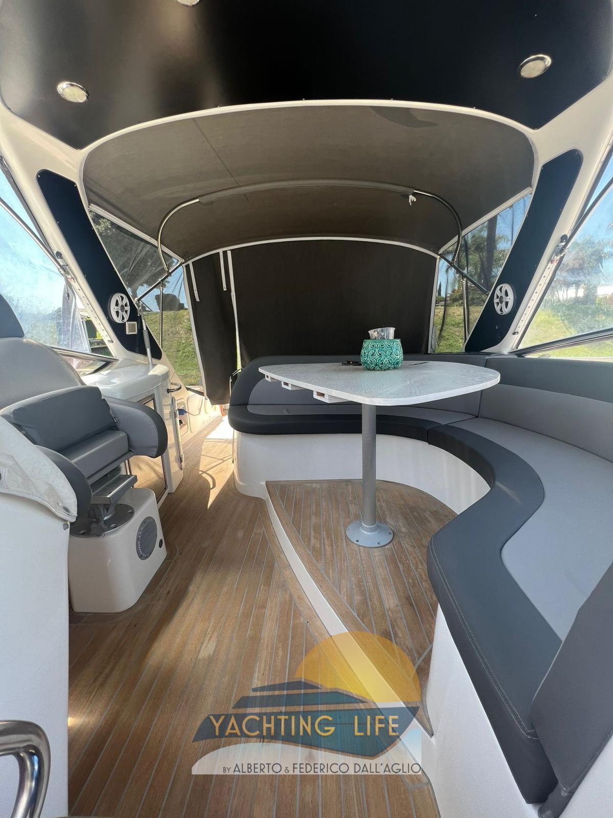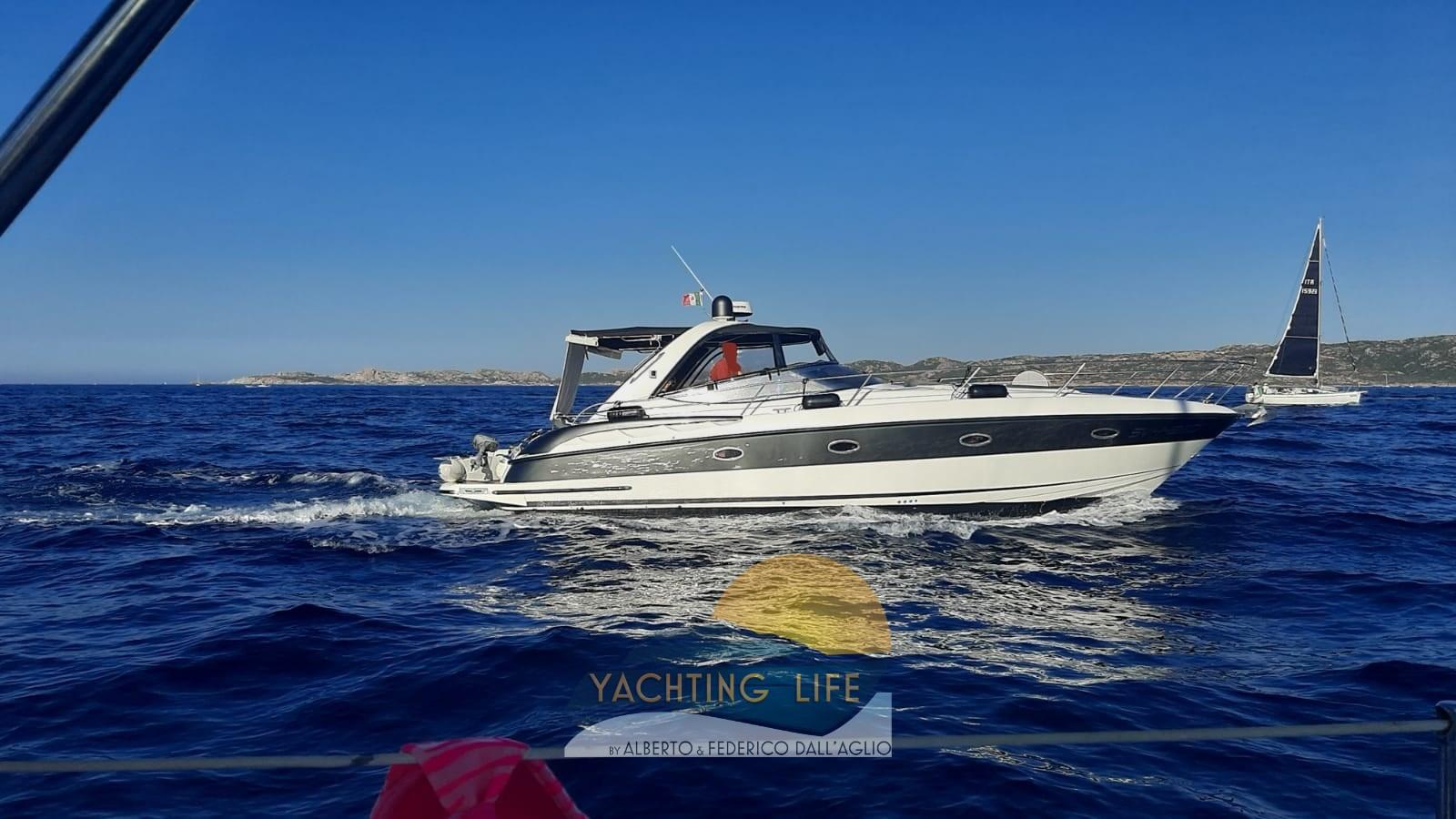 Alarme moteur, Ouverture du compartiment moteur électrique, Eau sous pression, Couleur spéciale (Grigio metallizzato), Douche de cockpit, Flaps hydrauliques, Garage à annexe, Indicateurs de flaps, Lavabo dans le cockpit, Éclairage de courtoisie (Led), Moteur d'annexe, Passerelle (Idraulica), Plateforme arrière (In teak), Pompe de cale automatique, Pompe de cale manuelle, Porte latérale, Cockpit en teck, Prise de quai, Rollbar, Guindeau électrique, Echelle de bain, table de cockpit, Annexe, Corne.