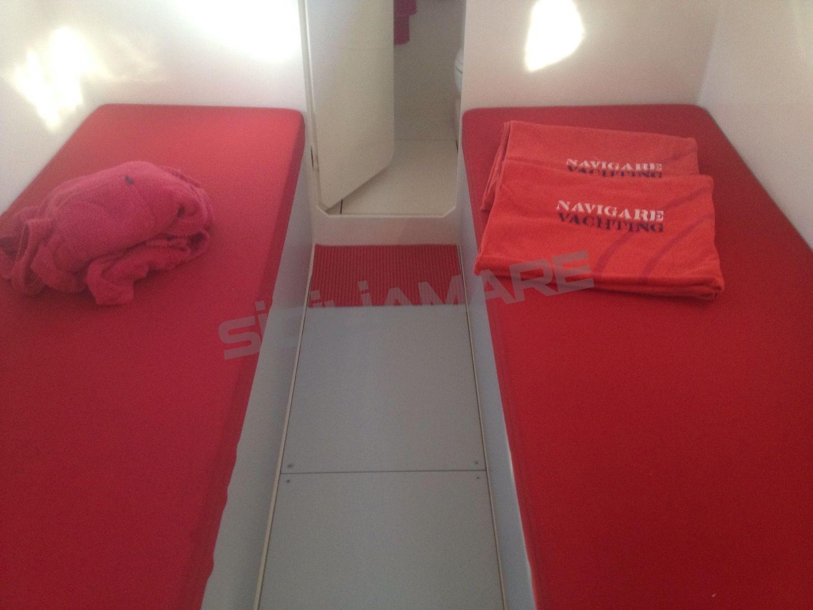 Alarme moteur, Ancre (custom Vismara), Eau sous pression, Chargeur de batterie (100 Ah), Douche de cockpit, Éclairage de courtoisie, Moteur d'annexe (FB tender), Passerelle (carbonio), Cockpit en teck, Prise de quai, Gréement Rod, table de cockpit (a scomparsa), Annexe, 3 Winch électrique (Harken custom 3 v).