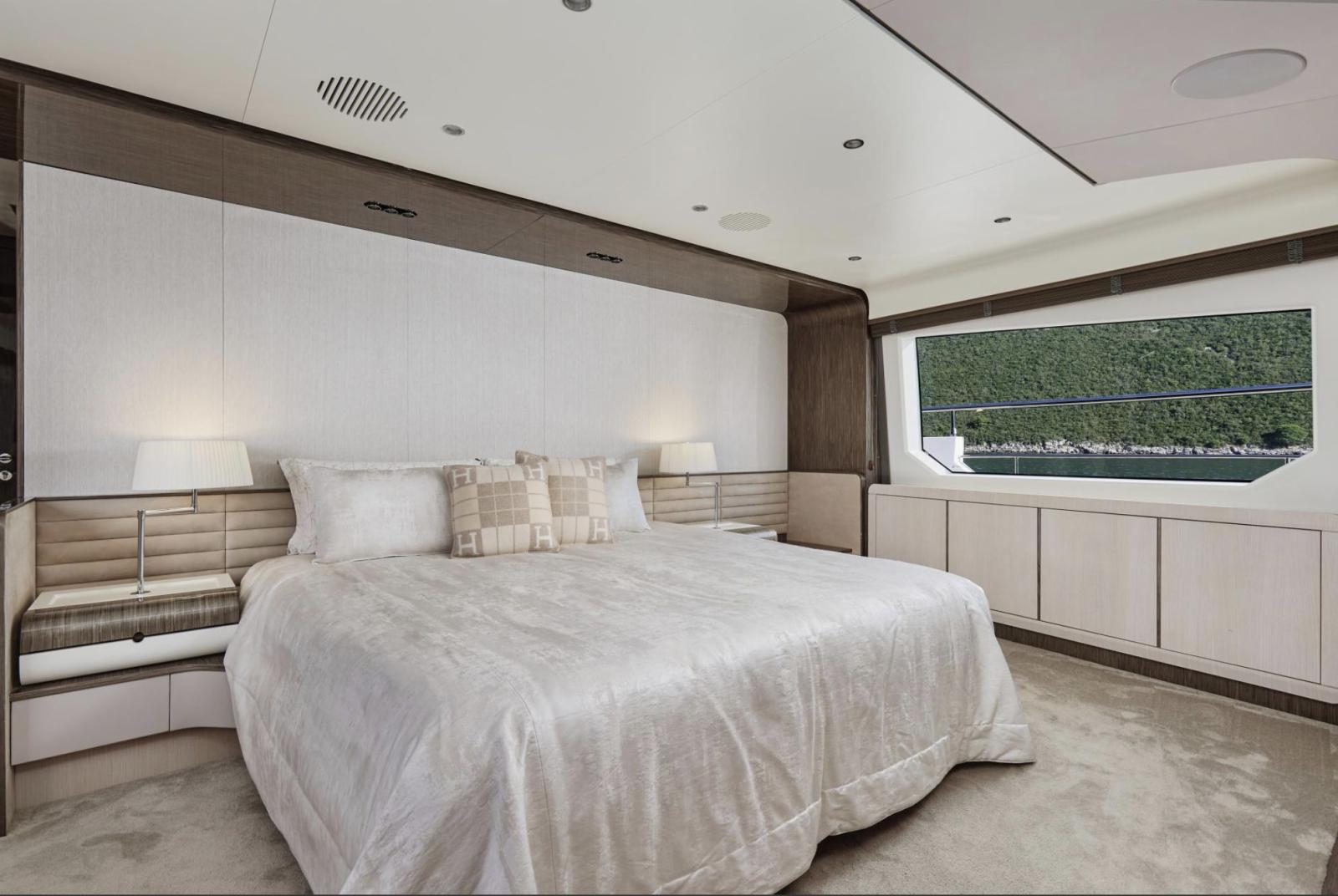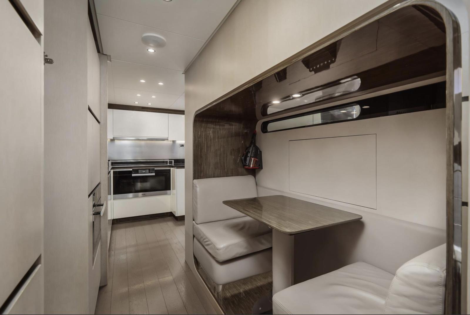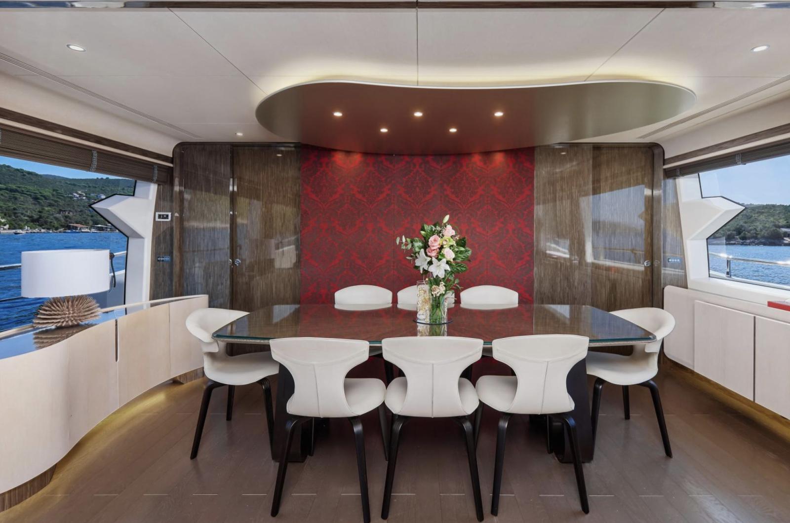 Dès la montée à bord, vous serez séduit par son aménagement élégant et son sens du détail. Le spacieux salon du pont principal reflète le meilleur du style italien moderne, mêlant tons neutres et touches de rouge raffinées. Les parquets en chêne argenté, les armoires en cuir et les tables en verre créent une atmosphère chaleureuse et sophistiquée, tandis qu’un système de divertissement AV/IT haut de gamme garantit une expérience immersive et fluide dans l’ensemble du yacht.