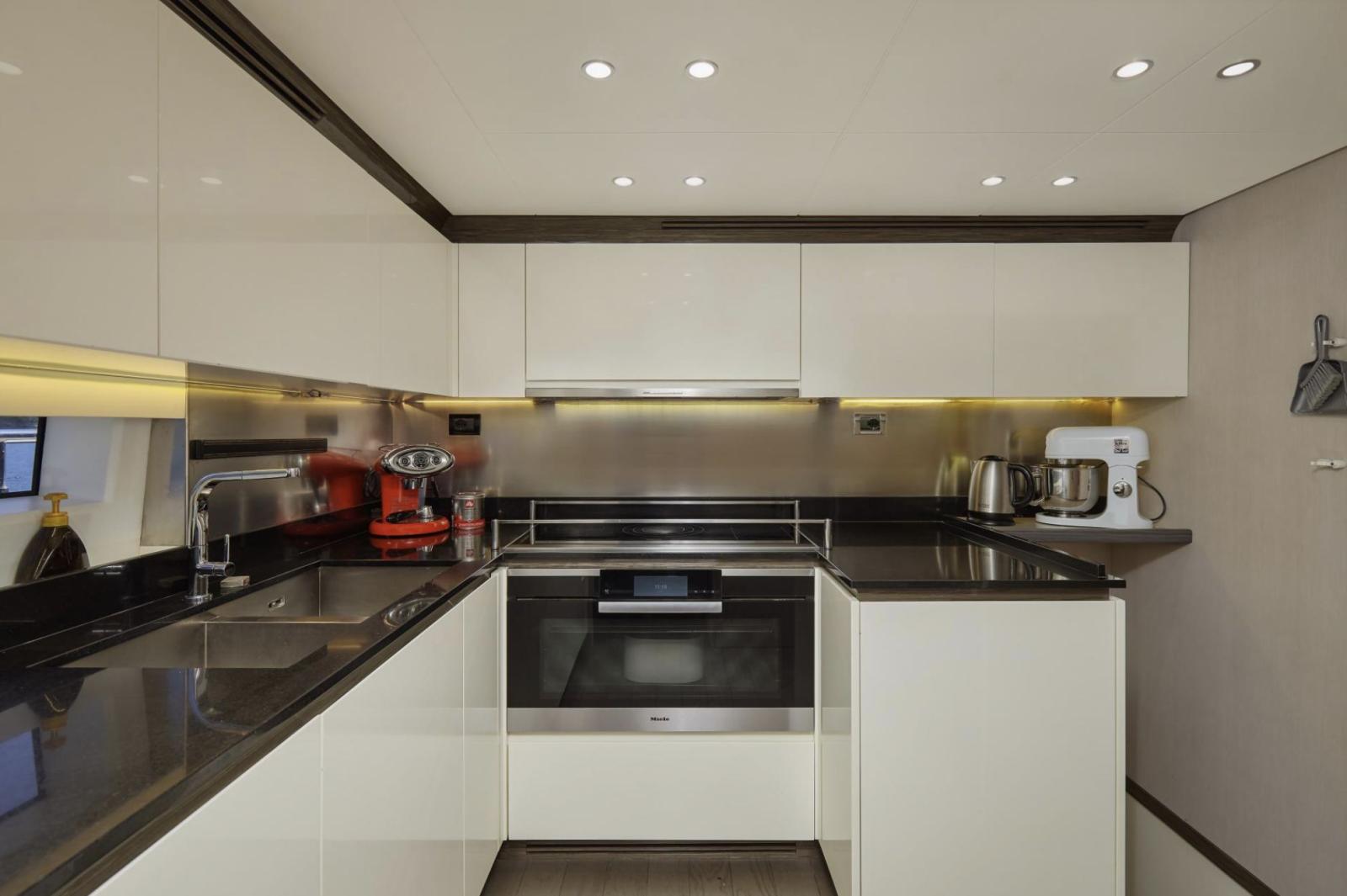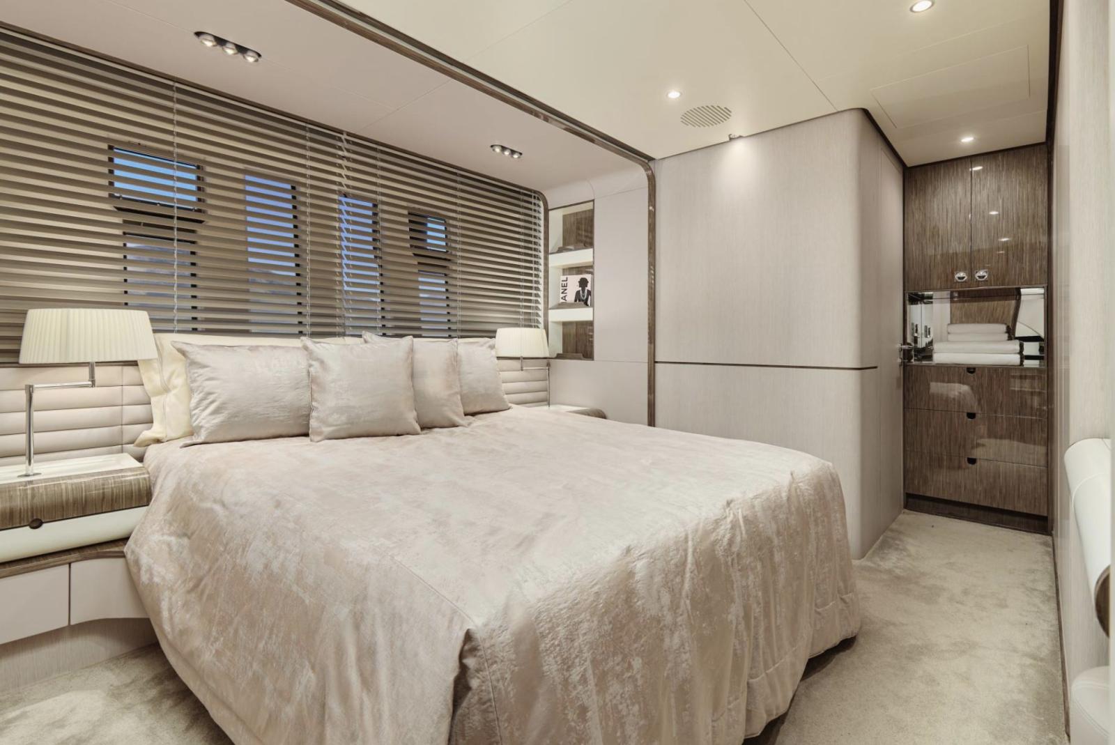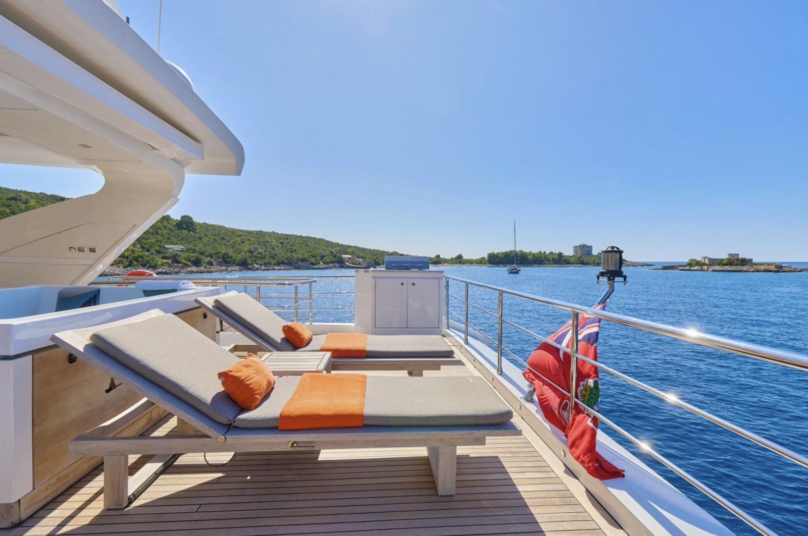 Dès la montée à bord, vous serez séduit par son aménagement élégant et son sens du détail. Le spacieux salon du pont principal reflète le meilleur du style italien moderne, mêlant tons neutres et touches de rouge raffinées. Les parquets en chêne argenté, les armoires en cuir et les tables en verre créent une atmosphère chaleureuse et sophistiquée, tandis qu’un système de divertissement AV/IT haut de gamme garantit une expérience immersive et fluide dans l’ensemble du yacht.